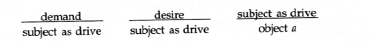 - 在要求里,主体是扮演的对象a(和精神病类似),它停留在想象界。