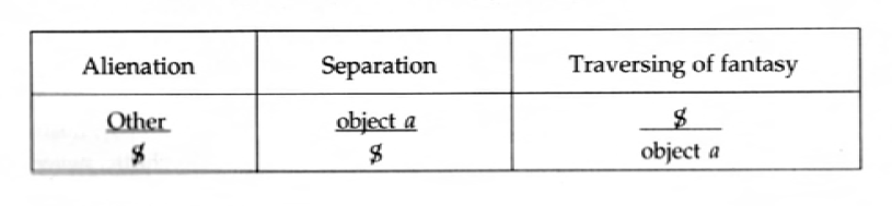 - 分离:对象a占主要地位支配主体,性倒错没有经历分离,因为他们就在对象a的位置,不允许大他者欲望成为自己的原因。