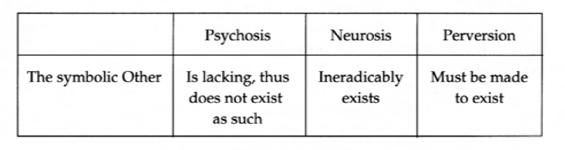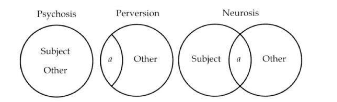 但是三者都离不开大他者,精神病会通过妄想让象征大他者存在,性倒错通过表演或者律令的施行让大他者存在,有些恐惧症也会把恐惧的对象放在父之名的位置上。