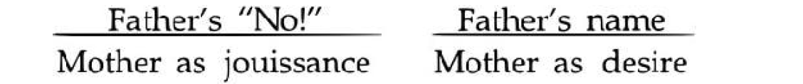 和弗洛伊德的弑父神话类似,拉康也在某种程度上构建了自己的神话,他说明,弗洛伊德式父亲的父姓功能是以语言学为基础的,功能是象征性的。父亲的作用就在于通过命名母亲欲望和性别差异:隐喻它(父姓隐喻)。