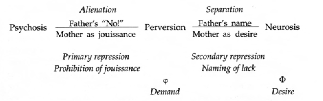 - 异化:大他者占主要地位,孩子被引诱进入语言,在快感和原则和现实原则之间做选择,精神病没有经历异化。