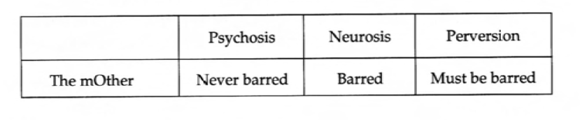 - 性倒错:母亲大他者没有被禁止而必须被禁止,这样性倒错才能成为除了母亲欲望对象以外的存在。