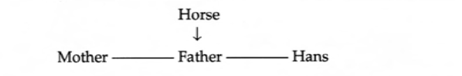 小汉斯个例中,小汉斯的父母在刚开始并没有给小汉斯一个出生的正常的解释,但是小汉斯在自己去发现出生的原因——母亲作为主要原因将孩子带到世界。小汉斯的母亲总是允许小汉斯的僭越,比如绕过父亲的不悦让小汉斯上她的床。小汉斯能发现父亲的不悦,也能提出“母亲想要什么”的问题,这说明小汉斯已经异化出自我,不是精神病,但是他不能用自己以外的东西去回答母亲的欲望问题。小汉斯会去问父亲在生育的作用,但是他的父亲往往会将原因全部交给母亲,这导致小汉斯相信他只是母亲欲望的产物,他活着只是为了服务母亲。小汉斯从来不怕两匹马只怕一匹马,一种解释就是两匹马代表了父母,而一匹马只有母亲,此时没有父亲他找不到自己和父亲的位置,他直面了母亲的欲望(小汉斯这么名字成为了母亲唯一欲望的能指),于是他需要马来成为阻挡在他和母亲之间的那道屏障,这道屏障其实本来是父亲的位置:
