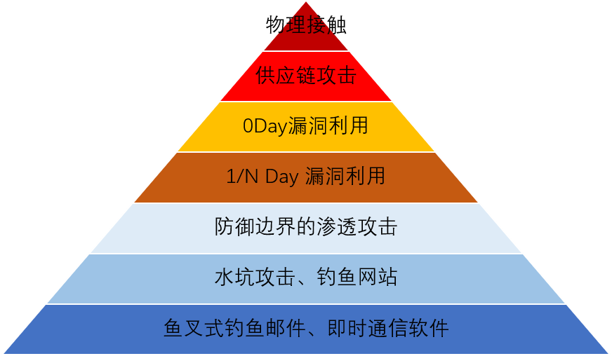 入侵金字塔,从下到上,入侵成本和危害程度逐层递增。