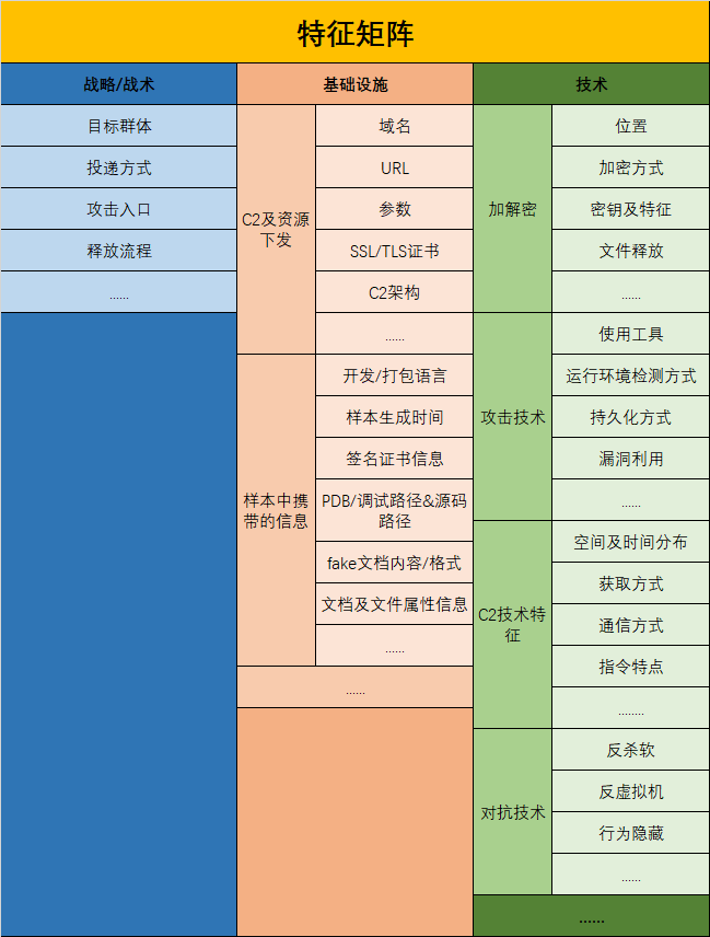 特征矩阵着重对APT活动技术上面进行描述。