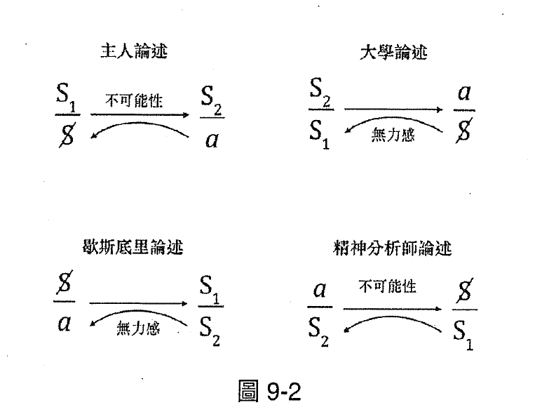 - 大学话语的再次显灵:女性癔症会对自己的道德和智商不安,包括不断地抱怨自己的记忆力、理解力等特征。这种症状在与大学话语的交互中不断互相作用,使得癔症只能从主人那里获得知识,产生对逻辑完备性的追求,并对现实世界的混沌性更加焦虑。而邪教的通俗本体论(如“所有痛苦皆因未觉醒”)提供了弗洛伊德的“海洋感情”,让癔症衍生出原初无我的幻觉,强行缝合了周围世界的裂隙。