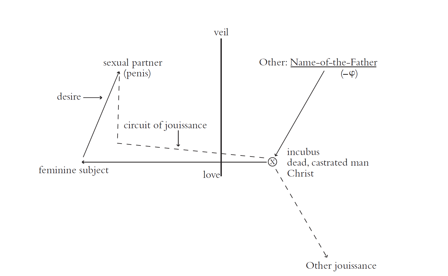 - 死亡父亲的幽灵:当邪教宣称“真神不在此间”,而邪教首领只是神的代行者时,恰恰激活了女性欲望中的“色情狂”结构。女性享乐的起源于女性面纱后的一个死去男性(如下图所示的“incubus”)的点,它强调了女性享乐在临床上与爱情不可否认的接近性,并解释了她们有时对爱情过度的幻想。邪教系统精心设计的不会降临的神将女性欲望指向了这样一个缺席的、不可能的他者,这样一个不可能的他者位置弥补了癔症在日常生活中缺失的强有力的父权制大他者。