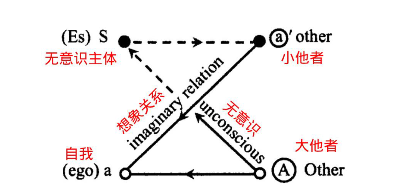 - 想象的相互性:主体对自身身份的认同,并非源于内在自足的本质,而是源于其与某一客体的想象性关系;在这种关系中,主体误以为与客体存在相互承认或对等互动(“想象的相互性”),而实际上,客体早已被主体的心理结构所占据、内化,成为构成“自我”的一部分——其实也就是镜子阶段。